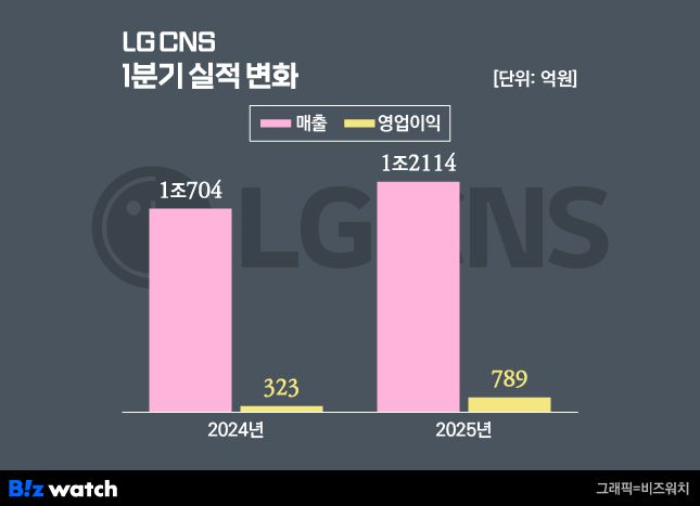 LG CNS는 올해 1분기 연결기준 매출이 전년동기보다 13.2% 증가한 1조2114억원으로 잠정 집계됐다고 28일 공시했다. 같은 기간 영업이익은 144.3% 뛴 789억원을 기록했다. 매출과 영업이익 모두 역대 1분기 기준 최대다.