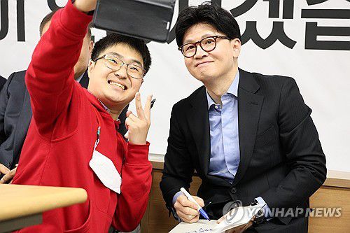 (대전=연합뉴스) 강수환 기자 = 국민의힘 한동훈 대선 경선 후보가 당원 간담회를 위해 28일 오전 국민의힘 대전시당을 찾아 지지자와 사진 찍고 있다. 2025.4.28.