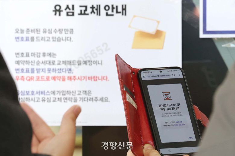 SK텔레콤이 가입자 유심 정보를 해킹당해 유심 무상 교체를 시작한 28일 서울 종로구의 한 SKT 매장에서 100번을 마지막으로 당일 교체 수량을 마감한 가운데 온라인 예약 페이지도 접속이 안되고 있다. 한수빈 기자 |
