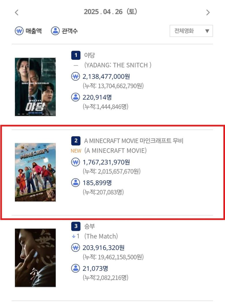 영화관입장권 통합전산망에 따르면 ‘마인크래프트 무비’는 개봉 첫날인 지난 26일 185,899명의 관객을 동원하며 ‘야당’의 뒤를 이어 전체 박스오피스 2위, 외화 박스오피스 1위에 올랐다.