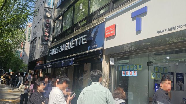 28일 오전 서울 중구 T월드 매장 앞에 가입자들이 줄을 서 기다리고 있다. /사진=비즈워치