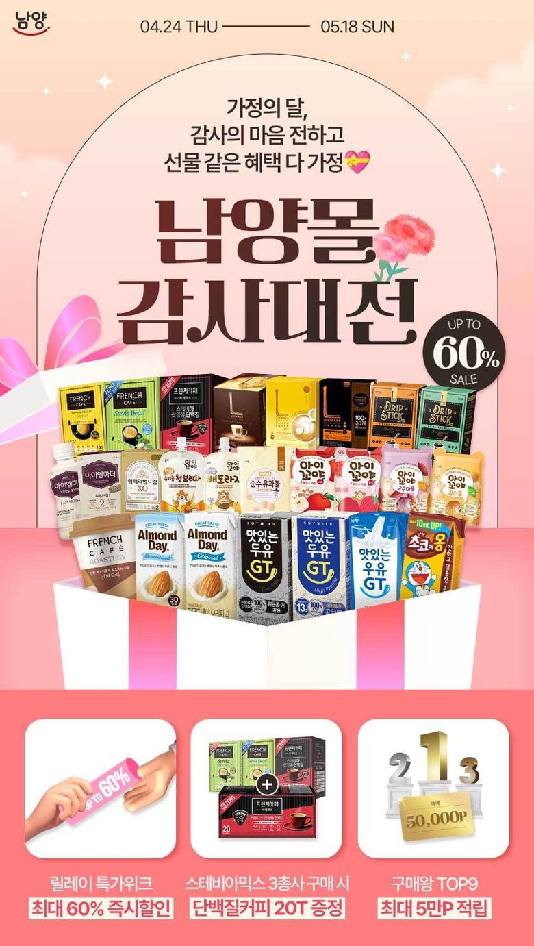 인더뉴스 장승윤 기자ㅣ남양유업은5월 가정의 달을 맞아 오는 5월 18일까지 자사몰 남양몰에서 최대 60% 할인 혜택을 제공하는 ‘감사대전’ 프로모션을 진행한다고 28일 밝혔습니다.