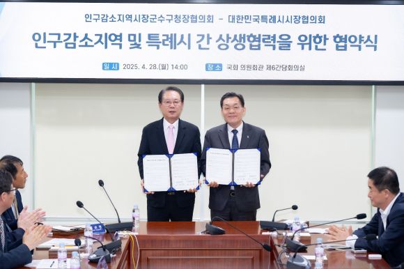 대한민국특례시시장협의회(대표회장 이재준 수원시장)와 인구감소지역시장·군수·구청장협의회(대표회장 송인헌 괴산군수)는 28일 국회 의원회관에서 상생협력 협약을 체결했다.