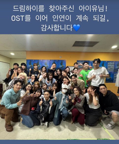 사진 속 아이유는 김예솔과 함께 편안한 차림으로 엄지 포즈를 취하고 있다. 박경림 등과 단체 사진 촬영에 임하기도 했다.