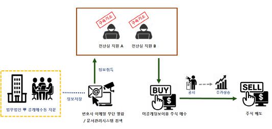 서울남부지방검찰청 금융조사제1부(부장검사 김수홍)는 28일 법무법인 광장의 전 전산실 직원인 가모(38)씨와 남모(40)씨를 자본시장법 위반과 정보통신망 침해 등 혐의로 구속기소했다. 같은 날 검찰은 미공개 정보를 이용해 부당이익을 챙긴 혐의 등을 받는 MBK파트너스 스페셜시츄에이션스(SS)의 전 직원 고모(30)씨 등 3명을 불구속 기소했다.