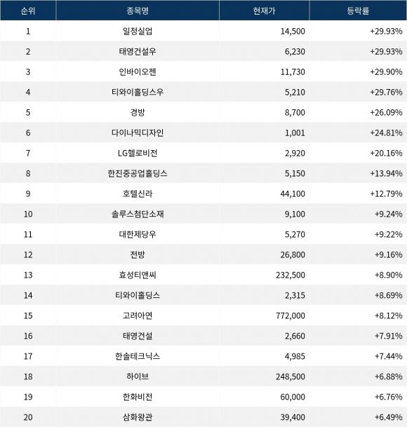 이어 상승률 2위 태영건설우(009415)는 주가가 29.93% 폭등하며 종가 6,230원에 상승 마감했다. 상승률 3위 인바이오젠(101140)의 주가는 11,730원으로 29.90% 폭등하며 강세를 보였다. 상승률 4위 티와이홀딩스우(36328K)는 29.76% 상승하며 5,210원에 마감했다. 상승률 5위 경방(000050)은 26.09%의 상승세를 타고 종가 8,700원에 마감했다.