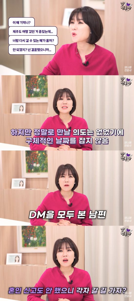 양나래 변호사는 지난 27일 자신의 유튜브 채널에 '신혼여행 중에 전남친과 DM만 했을 뿐인데 남편이 일방적으로 이혼 통보했습니다'라는 제목의 영상을 게재했다.
