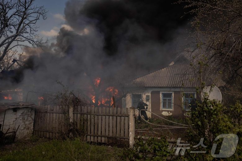 22일(현지시간) 우크라이나 도네츠크주 포크로우스크에서 러시아 군의 포격을 받은 주택서 불길과 검은 연기가 솟아 오르고 있다. 2025.04.25 ⓒ AFP=뉴스1 ⓒ News1 우동명 기자 |