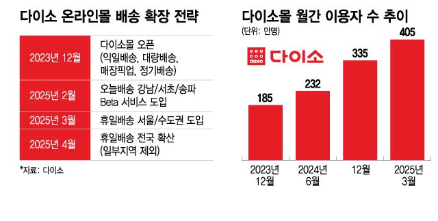 한편 다이소가 온라인몰에 주력하면서 이용자 수도 단기간에 급증하는 추세다. 앱 분석 서비스 와이즈앱·리테일에 따르면 다이소몰 월간 이용자 수는 2023년 12월 185만명에서 올해 3월 405만명으로 1년 3개월만에 2배 이상 증가했다.