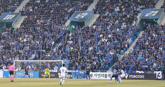 지난 2월 1일 인천축구전용경기장에서 열린 프로축구 K리그2 인천 유나이티드와 수원 삼성의 경기에서 축구 팬들이 관중석을 가득 메우고 있다. 인천=연합뉴스