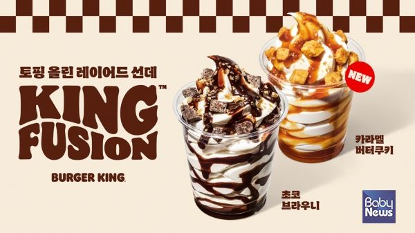 '킹퓨전’은 기존 사이드 제품인 선데를 업그레이드한 프리미엄 메뉴다. 기존 버거킹 선데 대비 풍부해진 원유 함량으로 더욱 진하고 고소해진 '밀크 선데’ 베이스에 진한 소스와 식감 가득한 토핑을 더한 것이 특징이다. 깊은 초콜릿 풍미의 시럽과 쫀득한 브라우니가 어우러진 '초코 브라우니 킹퓨전’과 바삭한 버터 쿠키와 카라멜 소스가 조화를 이루는 '카라멜 버터쿠키 킹퓨전’까지 총 2종으로 만나 볼 수 있다.