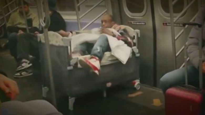 미국 뉴욕에서, 달리는 지하철에 아기 침대를 끌고 들어와 잠을 자는 남성의 모습이 포착됐습니다.