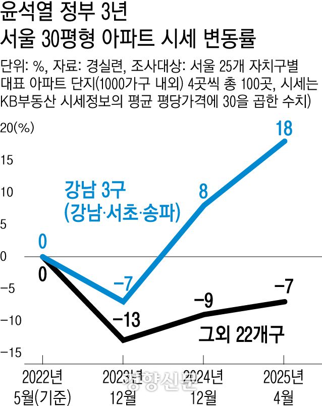 윤석열 정부 3년 동안 강남3구(강남·서초·송파구) 주요 대단지 평당 가격이 평균 18% 오른 것으로 나타났다. 강남 3구 이외의 서울 22개 자치구는 7% 떨어졌다. 이에 연 4200만원의 임금을 받는 노동자가 강남의 30평 아파트를 사려면 74년간 꼬박 모아야 가능한 수준에 이르렀다. 정부의 부동산 정책이 ‘강남 쏠림’ 현상을 가속화했다는 비판이 나온다.