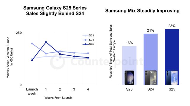 다만, 출시 초기 4주간 갤럭시 S25 시리즈의 판매량은 전년 동기 대비 9% 감소했습니다. 같은 기간 서유럽 내 삼성 전체 판매량이 17% 하락한 것과 비교하면 선방한 수준입니다. 서유럽 전체 스마트폰 시장은 9% 감소한 바 있습니다.