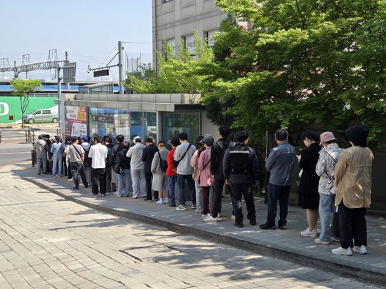 28일 오전 10시30분 노량진역 인근 SK텔레콤 직영점에 시민들이 유심(USIM) 교체를 위해 대기하고 있다. 약 170여명이 대기한 줄은 인근 골목까지 이어졌다. 박종서 기자
