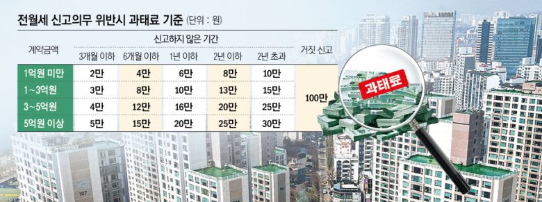올해부터는 신고 의무를 위반할 경우 과태료 부과가 가능해진다. 다만 정부는 과태료 부담을 낮추기 위해 기존 최소 4만~최대 100만 원이었던 부과액을 2만~30만 원으로 대폭 완화했다. 신고 지연 기간과 계약 금액에 따라 차등 부과되지만 고의적 거짓 신고를 제외하면 대부분 10만 원 이하 과태료가 부과될 전망이다.