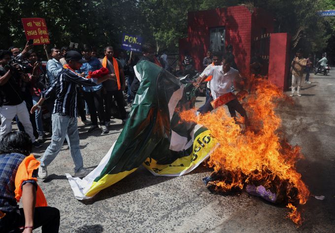 [아마다바드 로이터=뉴스핌] 홍우리 특파원 = 28일(현지 시간) 인도 구자라트주(州) 아마다바드에서 파할감 총기 테러 공격에 항의하는 시위가 열린 가운데 강경 힌두교 우익 단체 비슈와 힌두 파리샤드(VHP, 세계 힌두협회) 등의 활동가들이 테러리스트 형상과 파키스탄 국기를 불태우고 있다. 2025.04.28 hongwoori84@newspim.com |