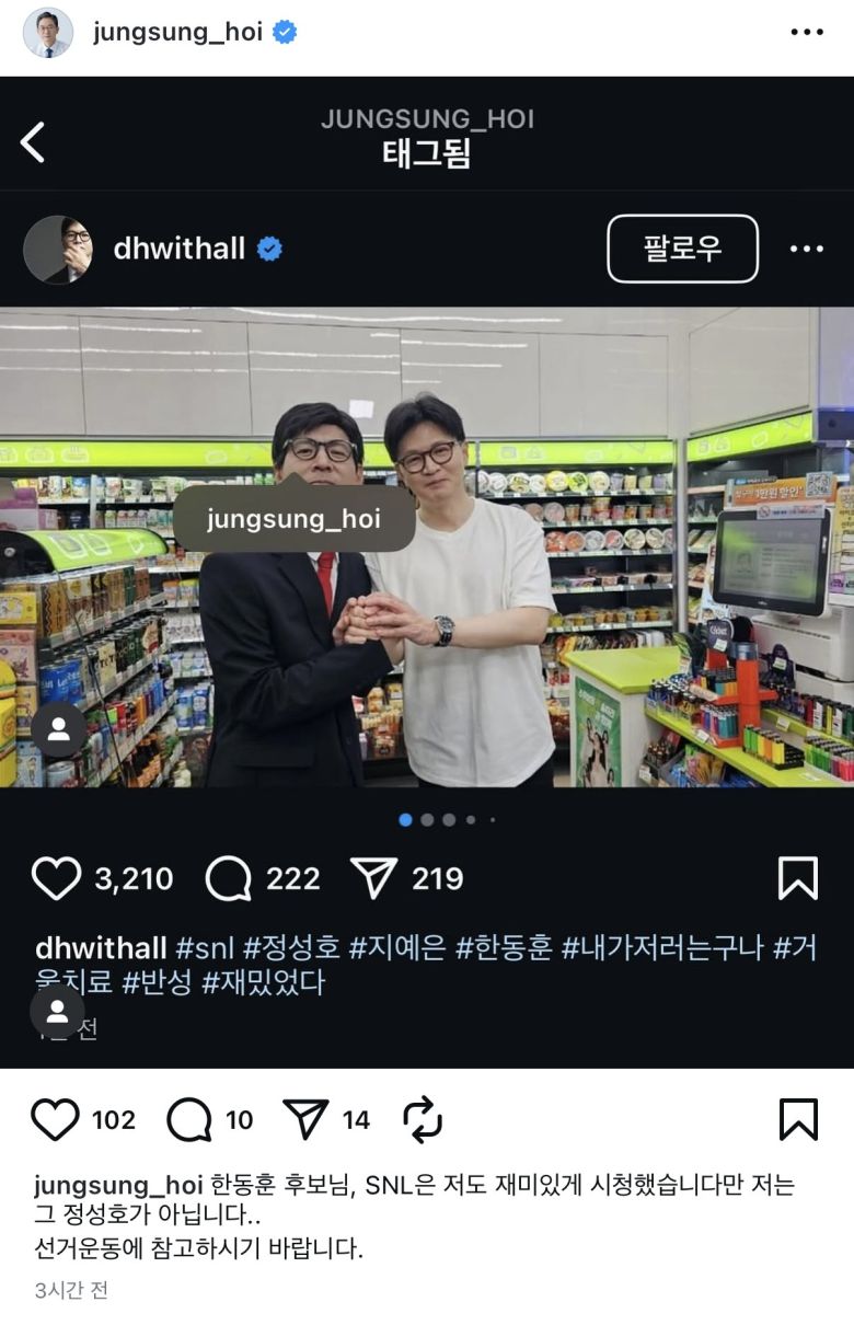 친명계 좌장으로 통하는 정 의원은 해당 사진을 본인의 SNS에 올리며 "한 후보님, SNL은 저도 재미있게 시청했습니다만 저는 그 정성호가 아니다. 선거운동에 참고하기 바란다"고 전하기도 했습니다.