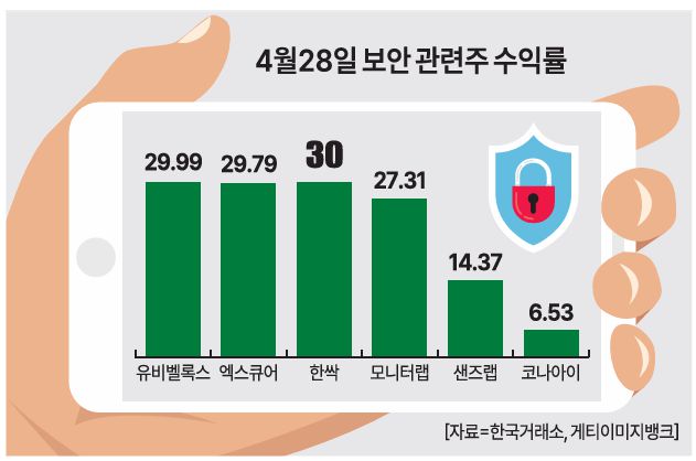 28일 한국거래소에 따르면 이날 보안 관련주인 유비벨록스와 엑스큐어, 한싹은 전 거래일 대비 각각 29.99%, 29.79%, 30,00% 급등하며 모두 상한가를 기록했다. 모니터랩(27.31%), 샌즈랩(14.37%), 코나아이(6.53%) 등 다른 보안 관련주들도 강세를 보였다.