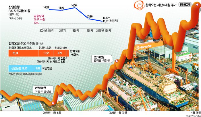 산업은행 입장에선 자꾸 낮아지는 국제결제은행(BIS) 자기자본비율 문제를 해결해야 하는 숙제도 한화오션 지분 매각을 통해 해결할 수 있다. BIS 자기자본비율은 은행의 건전성을 판단하는 지표인데 금융당국은 13% 이상을 권유하고 있다. 현재 산업은행이 보유한 주식 중 매각이 자유로운 것은 한화오션이 유일하다.