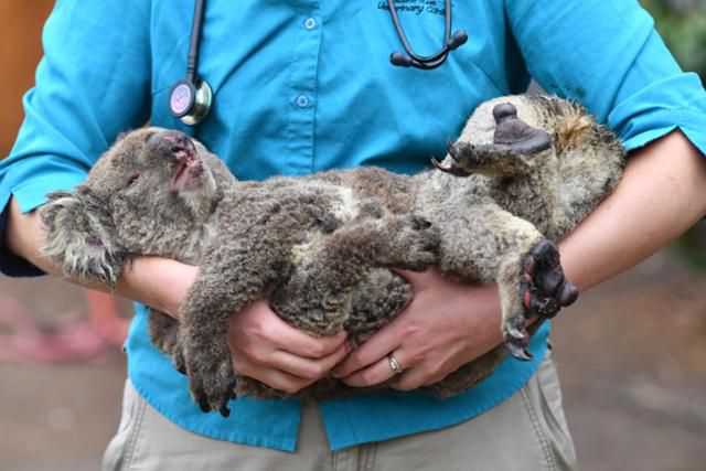 2020년 1월 호주 캥거루섬 산불 사태로 화상을 입은 채 구조된 코알라가 자원봉사를 하는 수의사 품에 안겨 있다. 사진은 기사 내용과 직접적 관련이 없다. EPA 연합뉴스 |