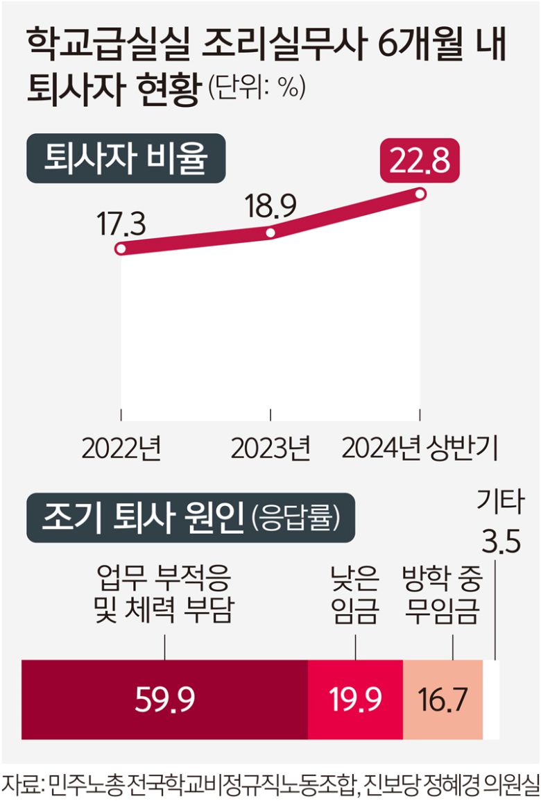 이들이 거리로 나선 이유는 노동환경이 해를 거듭할수록 악화하고 있어서다. 민주노총 전국학교비정규직노동조합과 진보당 정혜경 의원실에 따르면 입사 후 6개월 이내 퇴사하는 조리실무사 비율은 2022년 17.3%, 2023년 18.9%, 지난해 상반기 22.8%로 늘어났다.