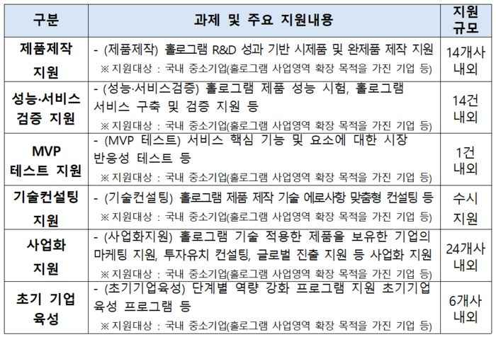 이번 사업으로 사업화·실증 단계에서 어려움을 겪는 전문기업을 대상으로 홀로그램 연구개발(R&D) 성과 기반 제품 제작, 홀로그램 성능·서비스 검증, 최소기능제품(Minimum Viable Product) 테스트, 기술 컨설팅, 국내외 전시 홍보와 투자유치 등 사업화, 초기 기업 육성 프로그램 등 기업 제품 제작부터 사업화까지 전과정 지원이 이뤄진다.