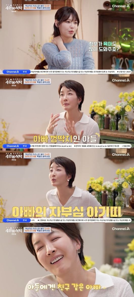 진서연은 남편이 육아를 잘한다며 “엄마 역할을 남편이 다 한다. 아들이 아빠 껌딱지다. 심지어 우리 남편이 인테리어 업을 하는데 현장을 가면 아기띠를 한다. 아기띠를 하고 다니는 게 자랑인 것이다”라고 말했다.