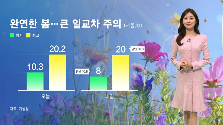 내일(29일)도 일교차가 크게 벌어지겠습니다. 서울의 아침 기온이 8도로 오늘보다 좀더 쌀쌀하겠고요. 낮에는 20도까지 올라 오늘만큼 포근하겠습니다. 입고 벗기 편한 옷을 입으시는 게 좋겠습니다.