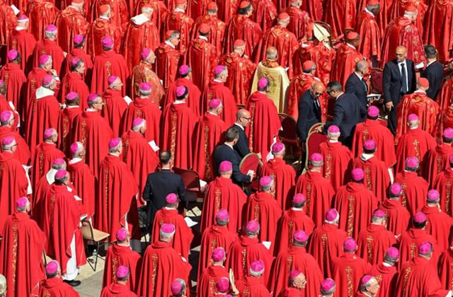 26일 바티칸 성 베드로 광장에서 열린 프란치스코 교황 장례 미사에 붉은 제의를 입은 추기경들이 참석하고 있다. 바티칸=EPA 연합뉴스 |