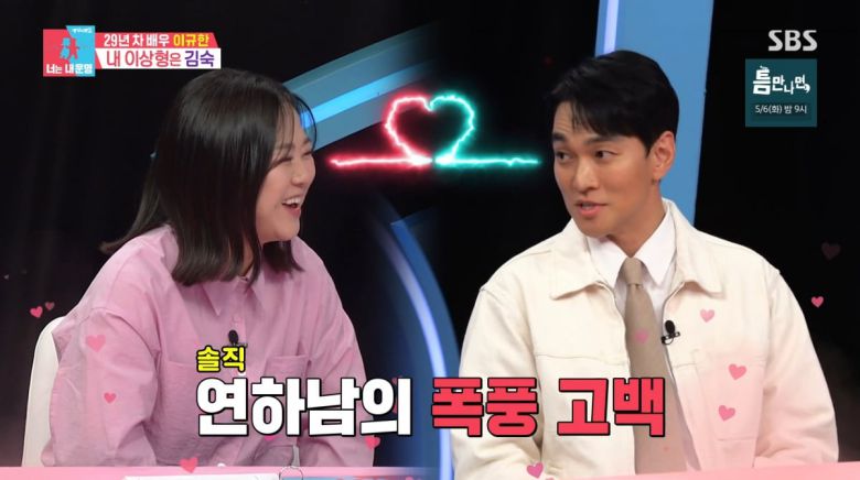 김숙은 "나 때문에 나왔나봐"라며 설렘을 드러냈고, 이규한은 "저도 웃기고 농담하는 거 좋아해서 위트있고 재미있는 분이 이상형"이라고 강조했다.