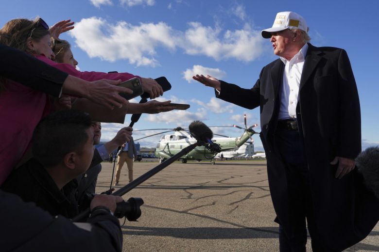 도널드 트럼프 미국 대통령이 27일(현지 시간) 미 뉴저지주 모리스타운 공항에서 전용기 탑승 직전 취재진의 질문에 답하고 있다. 고율 관세 부과에 따른 물가 상승 부담이 커지는 가운데 트럼프 대통령은 이날 자신의 트루스소셜 계정에 “관세가 부과되면 많은 사람의 소득세가 크게 줄어들거나 완전히 면제될 수 있다”고 주장했다. 모리스타운=AP 뉴시스