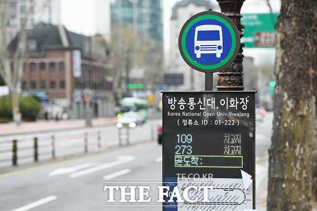 사진은 서울시내버스 노조가 총파업에 돌입한 지난해 3월 28일 오전 서울 종로구 방송통신대 버스정류장 전광판에 '차고지'라는 안내문구만 나오고 있는 모습. /더팩트 DB