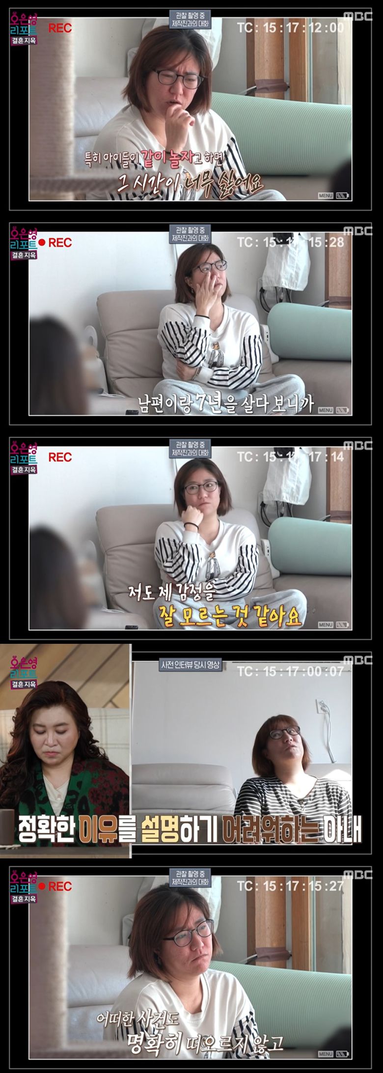 이날 사연을 직접 신청한 아내는 "이게 우울증인 것 같기도 하고 아닌 것 같기도 하다"며 "아이들이 같이 놀자고 하면 그 시간이 너무 싫다. 남편이랑 7년을 살다 보니까 저도 제 감정을 잘 모르는 것 같다. 이게 화가 나는 건지, 슬픈 건지, 답답한 건지"라며 자신의 감정 혼란의 원인이 남편에게 있다고 밝혔다.