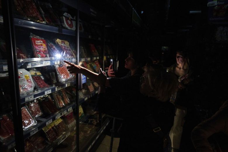 스페인 북부 팜플로나에서 28일(현지시간) 주민들이 정전으로 깜깜한 슈퍼마켓에 휴대폰 불빛을 이용해 물건을 고르고 있다. 이날 이베리아 반도의 스페인과 포르투갈이 대규모 정전 사태를 겪었다. AP 뉴시스 |