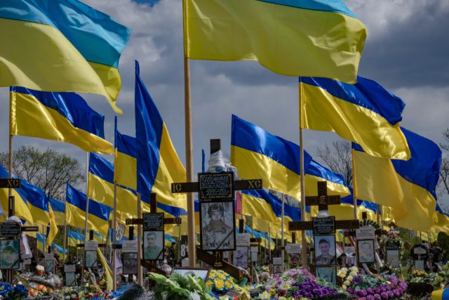 ▲27일(현지시간) 우크라이나 동부 도네츠크 지역 크라마토르스크 한 묘지에서 우크라이나 국기가 펄럭이고 있다. ⓒEPA=연합뉴스 |