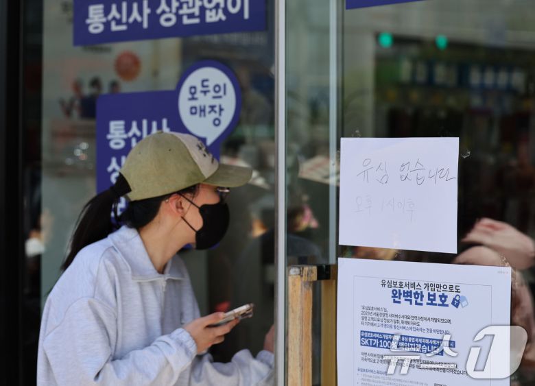 SK텔레콤이 유심 무료 교체를 시작한 28일 오후 광화문 일대 대리점에 통신사 이동 업무량 증가로 인한 일반 업무 지연을 안내하는 문구가 붙어 있다.2025.4.28/뉴스1 ⓒ 뉴스1 신은빈 기자 |