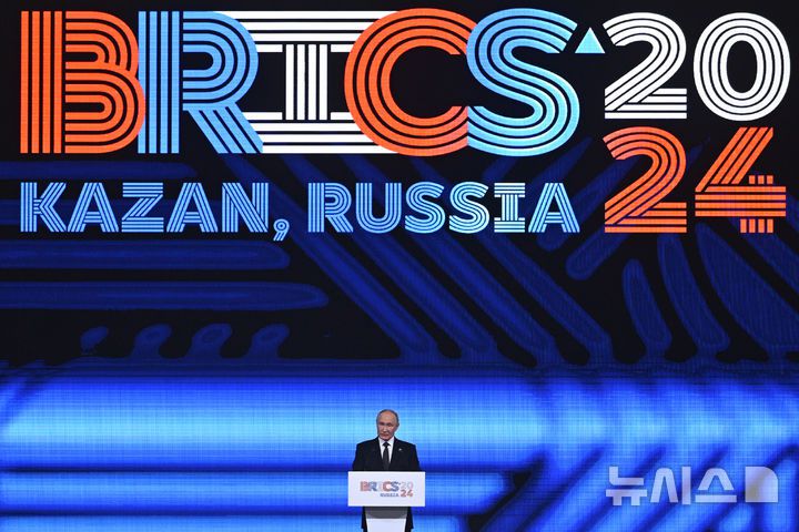 [카잔=AP/뉴시스] 중국과 러시아가 주도하는 신흥 경제국 11개국 연합체 브릭스(BRICS)가 28일(현지 시간) 브라질에서 외무장관 회의를 열고 미국 도널드 트럼프 행정부 관세 압박에 맞서 단일 전선을 구축하기로 했다.사진은 블라디미르 푸틴 러시아 대통령이 지난해 10월23일 러시아연방 타타르스탄공화국 카잔에서 개최된 브릭스 정상회의 환영행사에서 발언하는 모습. 2024.10.24.