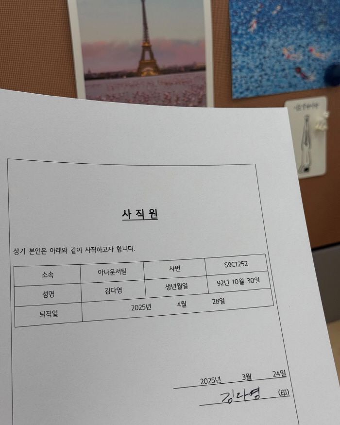 또한 이날 제출한 사직서도 공개, 퇴사와 함께 럽스타그램을 시작한 김다영이었다.