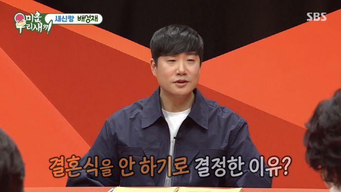 결혼식을 올리지 않고 혼인신고만 하기로 한 두 사람. 배성재는 이와 관련해 최근 SBS '미운 우리 새끼'에 출연해 "번거로운 걸 싫어하는 스타일이기도 하고 결혼식 사회를 많이 봤는데 항상 신랑신부가 지쳐하더라. 좋은 날이지만 힘든 날이기도 하더라"며 "식장을 잡거나 뭔가를 준비하는 시간이 오래 걸릴 것 같아서 다 생략했더니 너무 편하더라"고 밝혔다. 이어 "예비신부도 동의했다. 이야기 했더니 본인도 그렇게 할 마음은 없고 빨리 간단하게 끝내고 생각을 했다"며 천생연분 모습을 보여 눈길을 끌었다.