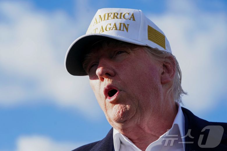 도널드 트럼프 미국 대통령이 27일(현지시간) 워싱턴으로 가기 위해 뉴저지주 모리스타운 공항에서 취재진을 만나 “볼로디미르 젤렌스키 우크라이나 대통령과 회동은 멋지고 아름다운 회의였다”고 말하고 있다. 2025.04.28 ⓒ 로이터=뉴스1 ⓒ News1 우동명 기자