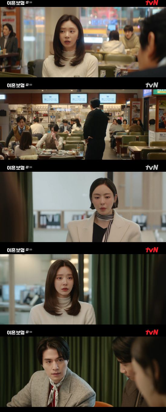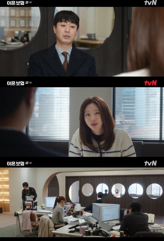 28일 방송된 tvN 월화드라마 '이혼보험' 9회에서는 강한들(이주빈 분)과 노기준(이동욱)이 김선만(배유람)의 이혼을 두고 대립한 모습이 그려졌다.
