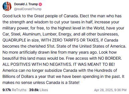 트럼프 대통령은 "미국은 이제 더 이상 매년 수천억 달러에 달하는 돈으로 캐나다를 지원할 수 없다. 캐나다가 미국의 주가 되지 않는 한, 지금처럼 지원을 계속하는 것은 말이 되지 않는다"고 덧붙였다.