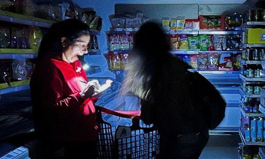 28일(현지시각) 스페인 바르셀로나의 한 슈퍼마켓에서 정전으로 불이 꺼진 가운데 한 직원이 손전등 불빛에 의존해 고객을 돕고 있다. 로이터 연합뉴스 |