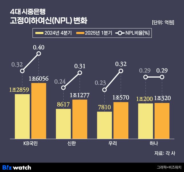29일 각 사에 따르면 올해 3월 말 4대 은행(KB국민·신한·하나·우리)의 합산 고정이하여신(NPL) 잔액은 4조8223억원으로 지난해 말 3조9486억원보다 8737억원(22.1%) 증가했다.