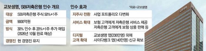 28일 교보생명은 이사회를 열고 SBI저축은행 지분 50%+1주를 내년 10월까지 인수하기로 결의했다. 인수금액은 9000억원이다. 지분 매각에 나선 SBI홀딩스는 SBI저축은행 지분 85.23%를 보유한 최대주주다. 4월25일 A1·12면 보도