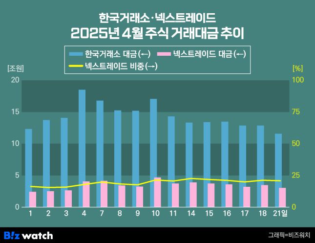한국거래소와 넥스트레이드 2025년 4월 주식 거래대금 추이/그래픽=비즈워치 |