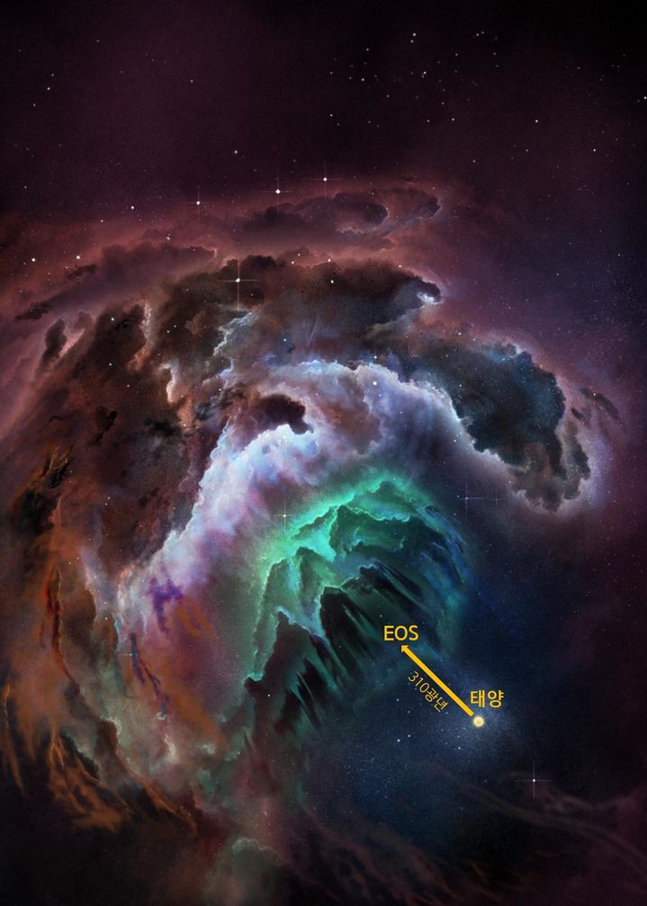 한국천문연구원이 참여한 국제공동 연구진은 우리나라 최초의 천문관측위성을 통해 태양에서 가장 가까운 분자운을 최초로 발견했다고 29일 밝혔다. 사진은 이번에 태양에서 가장 가깝게 발견된 분자운 EOS와 태양 사이의 거리. 태양으로부터 약 310광년 떨어져 있다. (사진=천문연 제공) *재판매 및 DB 금지 |