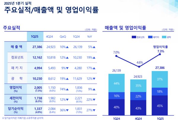 삼성전기는 한국채택국제회계기준(K-IFRS) 2025년 1분기 연결기준 매출액 2조7386억원 영업이익 2005억원을 기록했다고 29일 밝혔다.