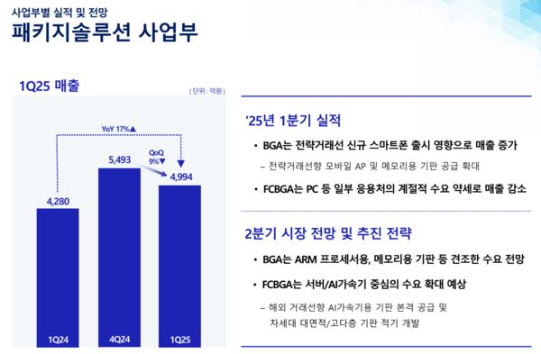 패키지솔루션 사업부도 1분기 세계 프리미엄폰 신제품 경쟁 후광을 입었다. 모바일 애플리케이션프로세서(AP)와 메모리반도체용 BGA 공급이 많았다. 반면 플립칩(FC)-BGA는 PC 등 계절적 수요 약세 영향을 피하지 못했다.